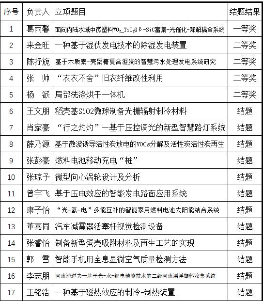 202110月7日,能源学源举行大创项目立项答辩、结题验收会议,经学生负责人申请,评委审查,2021年新立项项目23项,结题验收项目17(2020年秋立项)。现将结题结果进行公示。如有异议,请在公示期内联系宫汝志,联系电话13836034807。